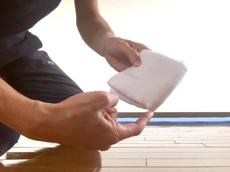 1)フェイスタオルを用意して四つに折りたたみます。そして角の部分が頭頂やや後部にあるラムダ縫合の頂点に当ててください。