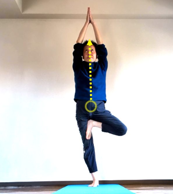左足を右の股間につけて片足立ちになります。左右の手を上げて静止します。ここでできれば眼球は眉間のサードアイに向けるのが好ましいんですけど、初心者の場合はバランス維持が難しいので、省略して構いません。
