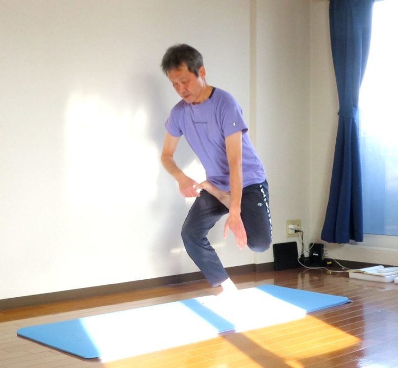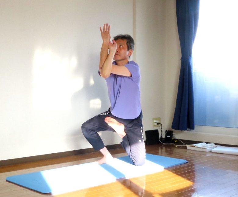 1)片足を持ち上げてセミパドマになりながらしゃがみます。
