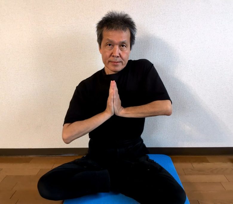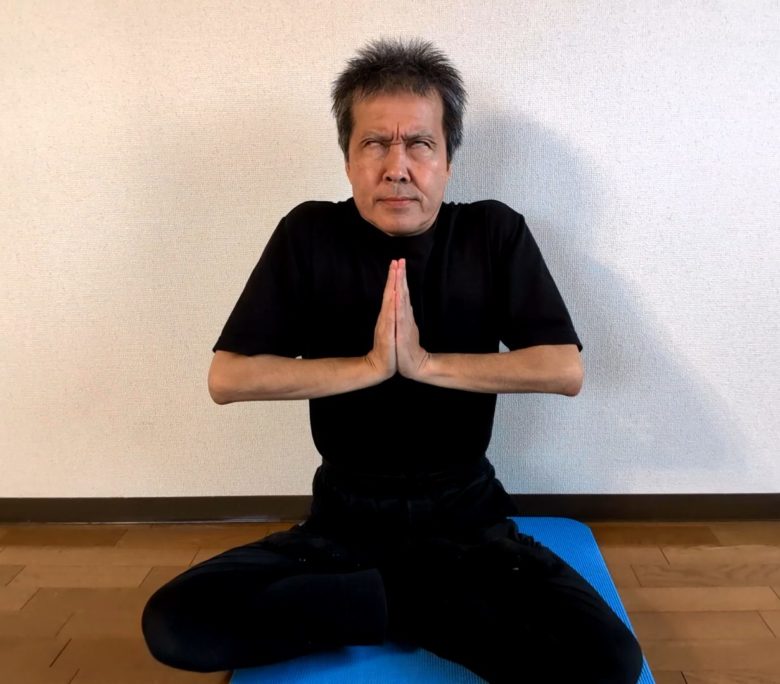 1)背筋を立てて座ってください。(イスでも床でもどっちでもよいです。)そして左右の手を合わせてナマステ