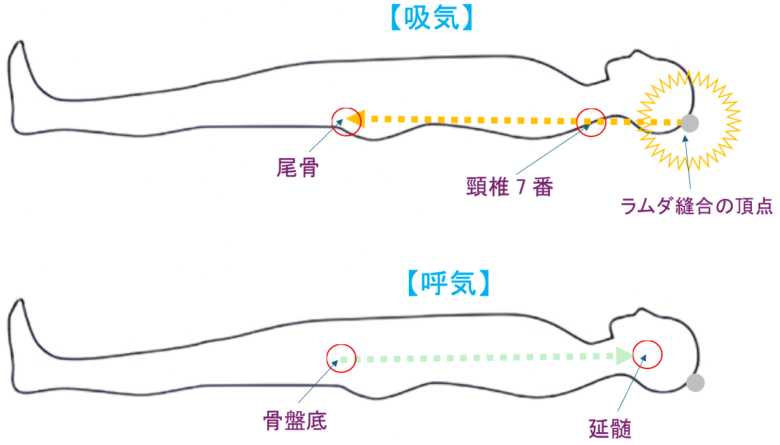 それから首の最下部(頸椎7番)のポコンと飛び出た凸に向かって進入して脊髄に流れます。1回の吸気でプラーナの流れは尾骨に到達します。