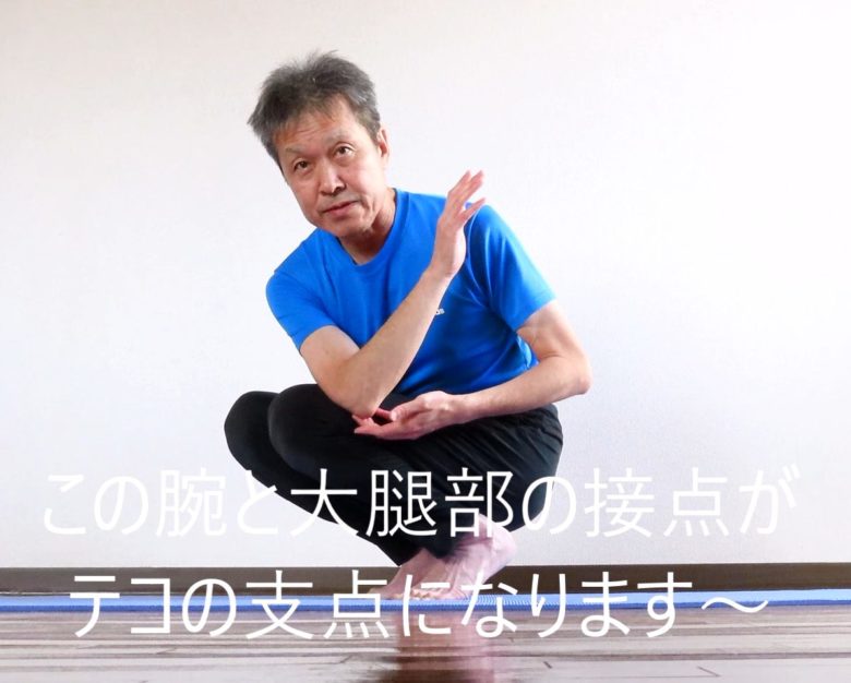 4)左右の手をマットに置きます。このとき上腕と大腿部の接点がしっかりと維持させます。これがこのアサナの肝心要のテコの支点になります。
