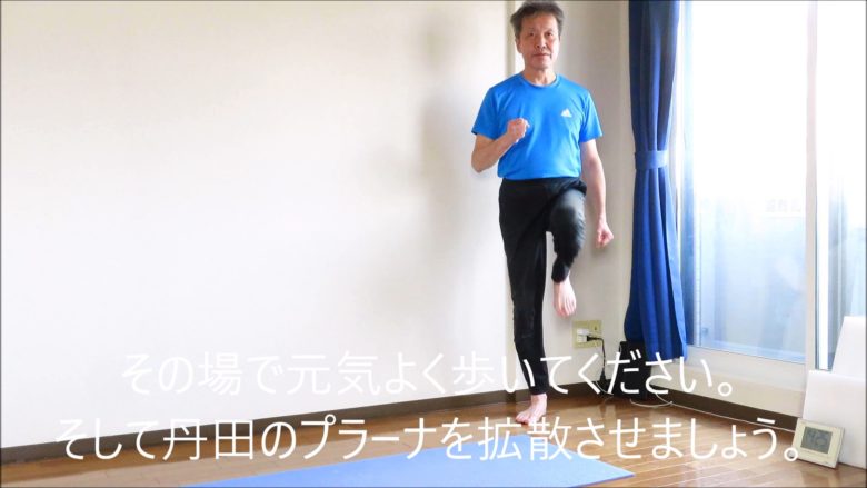 7)立ち上がってください。下腹部の丹田にエネルギーが充満しているのを実感しますよ。そして元気よくその場歩きしてプラーナを拡散してください。ハツラツ壮快な自分に即効変身!喜ぶに満ち溢れますよ。