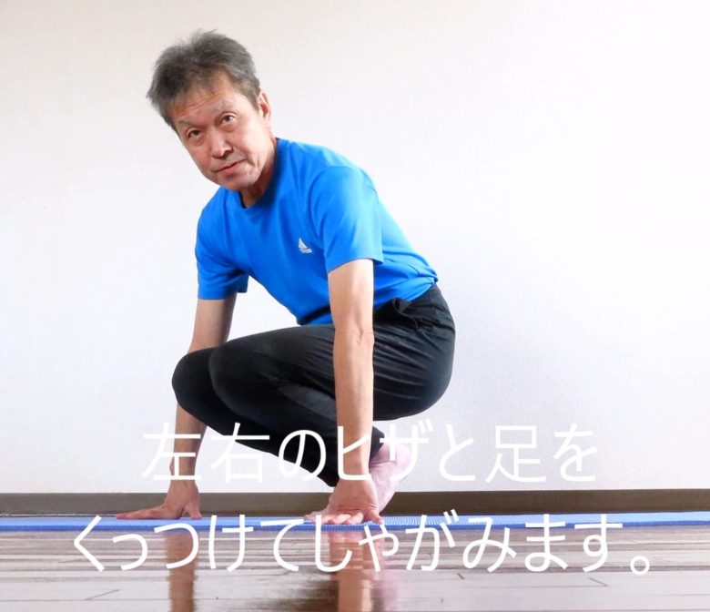 1)左右の足とヒザをくっつけてしゃがみます。