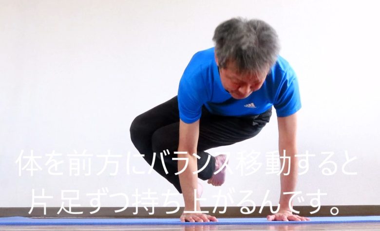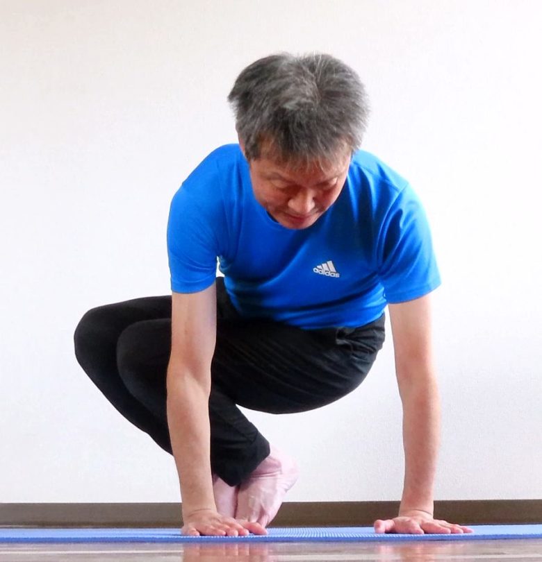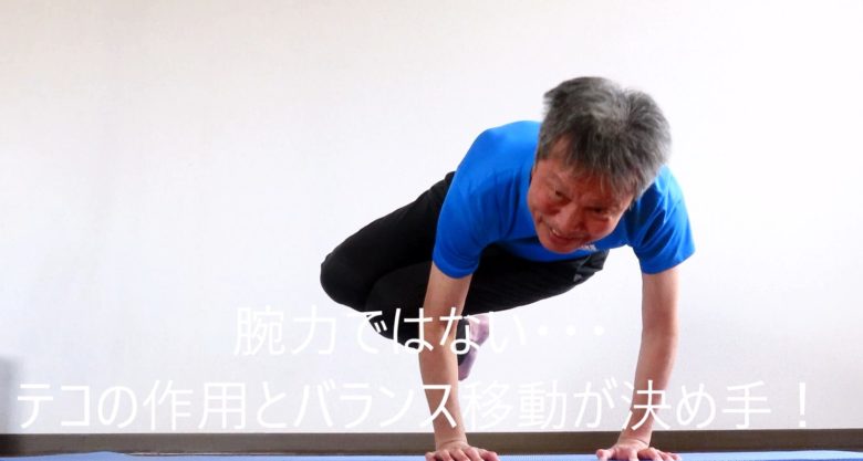 このアサナはアームバランスの初心者にとってもお勧めで、札幌スタジオや東京での実際のレッスンでも、施術後のセルフケア対策としてよくおこなっています。理由はテコの原理とバランス移動を理解すると、誰でもちょっと練習するだけですぐにできるからです。