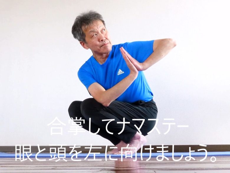 3)合掌してナマステー。目と頭を左に向けましょう。